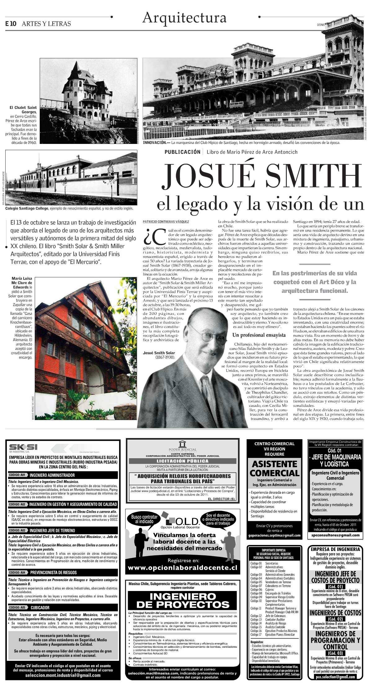 El 13 de octubre se lanza un trabajo de investigación que aborda el legado de uno de los arquitectos más versátiles y autónomos de la primera mitad del siglo XX chileno. El libro «Smith Solar & Smith Miller Arquitectos», editado por la Universidad Finis Terrae, con el apoyo de «El Mercurio».